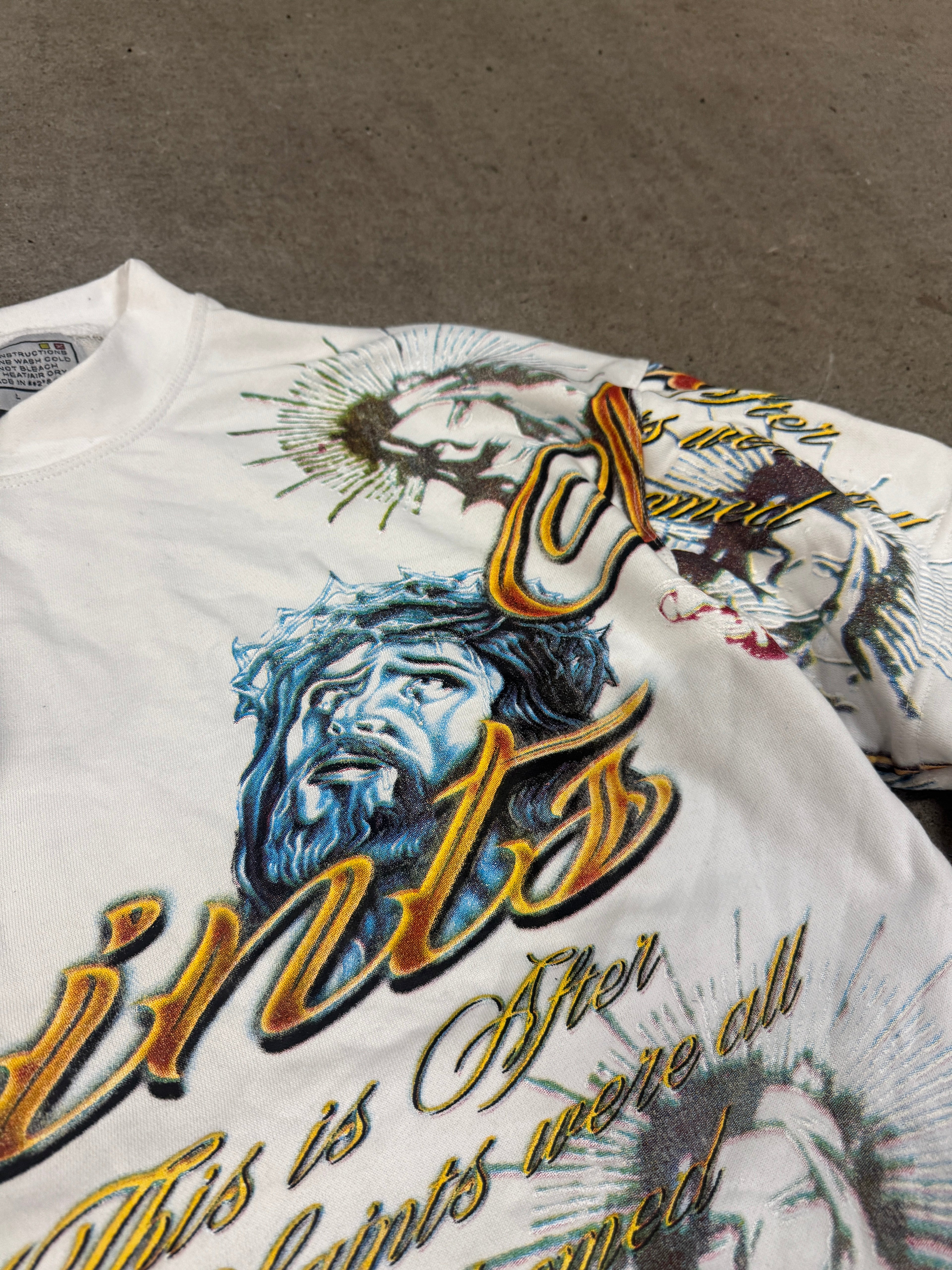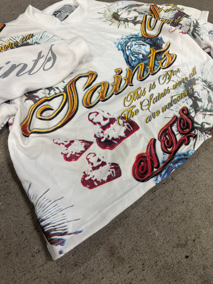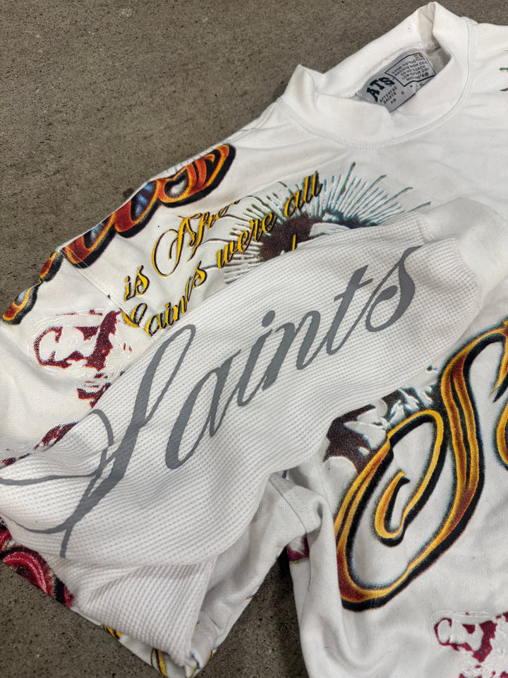 -“SAINTS” in script running down the sleeve